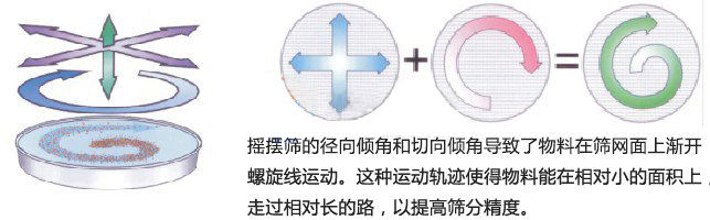 物料在圓形搖擺篩篩面上從中心到外圍擴(kuò)散,物料均勻在篩面上做跳躍旋轉(zhuǎn)的螺旋運動,無法篩分到下層的物料會在該層面的出料口排出,直至所有物料篩分完畢。工作任務(wù)結(jié)束。